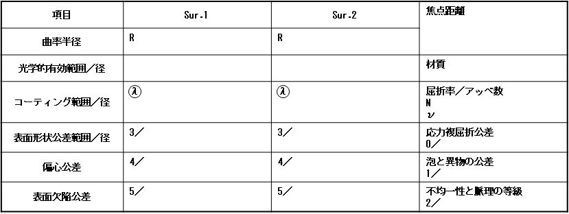 ![]() | 光学素子の場合、どんなものでも共通して評価すべき特性というのがあります。しかし、それを注記に羅列すると見にくいですよね。 | |