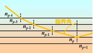 さて、蜃気楼の説明に戻りましょう。図4の例だと、確かに屈折率は下から上に向かって単調増加(…\(>n_{p-4}>n_{p-3}>n_{p-2}>n_{p-1}>n_{p}>n_{p+1}>\)…)しているんですが、![]() 図7.蜃気楼の発生メカニズム(2) その境界面で次々とSnellの法則に従い屈折を繰り返し、どこかの境界面で全反射を起こします。 | |