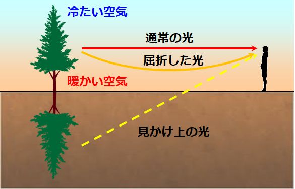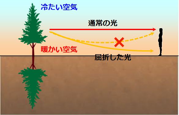 ![]() | その場合は、下位蜃気楼という現象になります。他にも極めてレアケースですが、鏡映蜃気楼という現象も起こったりします。興味があれば調べてみるといいですよ。 | |