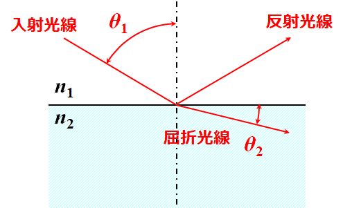 屈折率\(n_1\)の媒質から屈折率\(n_2\)の媒質へ入射した光線は、その境界面で反射と屈折を生じます。![]() 図6.Snellの法則(\(n_1>n_2\)の場合) このとき、入射角\(\theta_1\)と屈折角\(\theta_2\)は次のSnellの公式を満たします。 \[ n_1 \sin \theta _1 = n_2 \sin \theta _2 \] | |