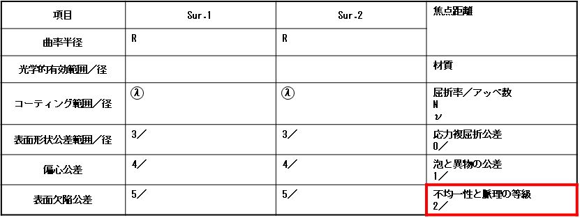 ![]() | さっきの例だと、等級2だから±5×10-6ですね。通常の屈折率公差が±5×10-4だから、屈折率公差の1%くらいの不均一性を許容している計算か…。 | |||||||||||||||