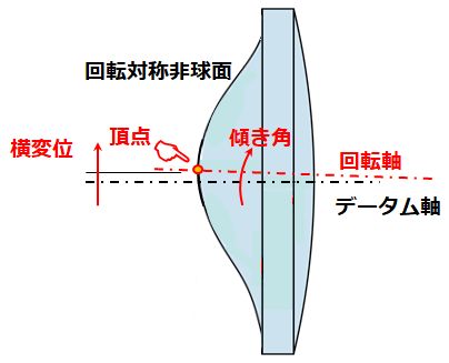 たいていの場合は、それで問題ないと考えられます。このとき、データム軸に対する頂点(回転対称点)のずれ量(横変位)としてシフト偏心が、テータム軸に対する回転軸の傾き角としてチルト偏心が定義できます。![]() 図7.非球面の偏心 | |