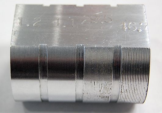 そうです。![]() 図8.Raのサンプル(左から実測値で、1.2、4.1、29.5、46.7) 図8はRaのサンプルですが、数値と見た目は少なくとも対応づけておいた方がいいです。 | |