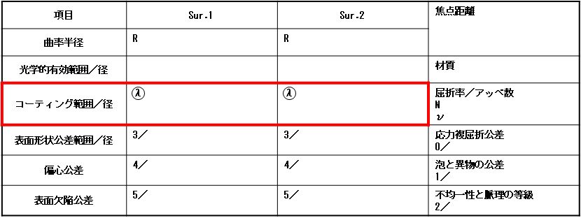 ![]() | 図面に指示します。保護的表面処理は、光学的有効径(有効範囲)よりも外側に施すのが普通ですし、しかもコバ部分にも処理しないといけないケースが多いですから、要目表で指示するより合理的なんですよ。 | |||||||||||||